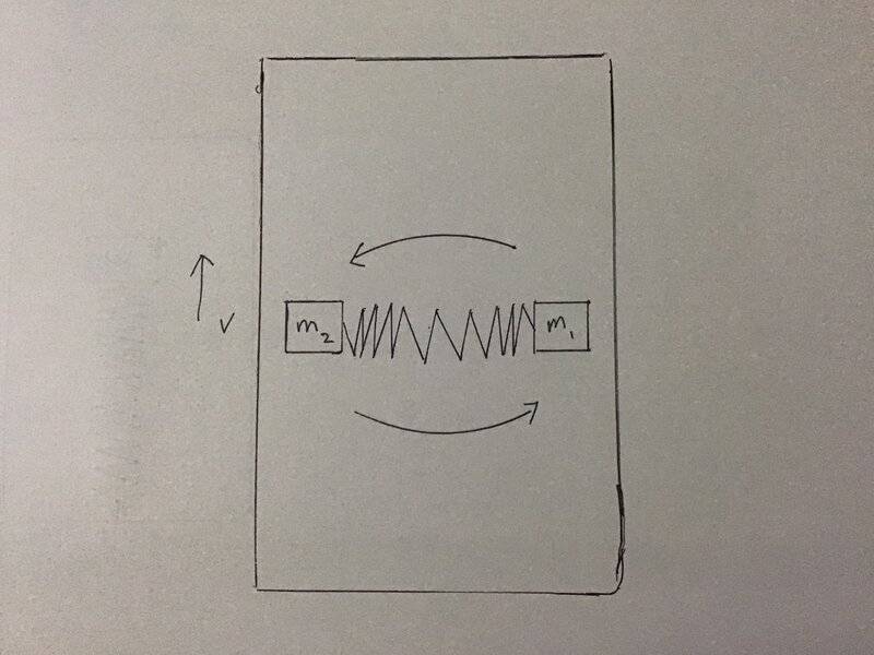 - Top view of the train shown a rotating pair of mass m1 and m2 attached to a slinky. The train is moving north with constant speed v. At 0 degree, m1 is released from the slinky and move north to hit the train inelasticly. The slinky is fully contract when the system rotate 180 degrees. During this time, m2 continue to go in circle until 180 degrees. m2 is then released from the slinky and move north to hit the train. Determine the final speed of the train: