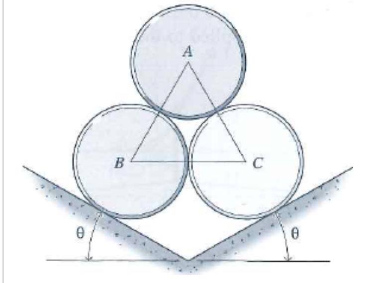 - The question is: Three smooth homogeneous cylinders A, B, C are stacked in a V shaped through as shown in the figure below. Each cylinder weights 100 [N] and has a diameter 5 cm. Determine the forces exerted by the supports on the pipes at contact surfaces. Angel theta is equal to 30 degrees