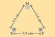 Three long parallel wires are 3.5 cm from one another. (Looking along them, they are at three corners of an equilateral triangle.) The current in each wire is 8.00 A, but its direction in wire M is opposite to that in wires N and P. Determine the magnitude of the magnetic field midway between points M and N.