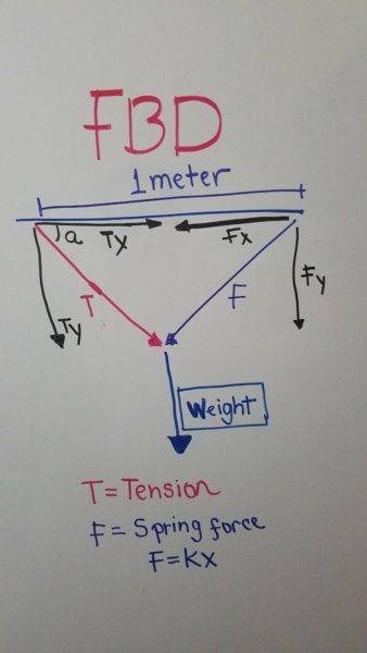 Fx = 0 and Fy = 0 but I have to find a way to determine the tension from the left side in terms of the α and the force of the string in terms of its constante and the angle.