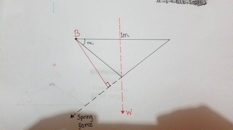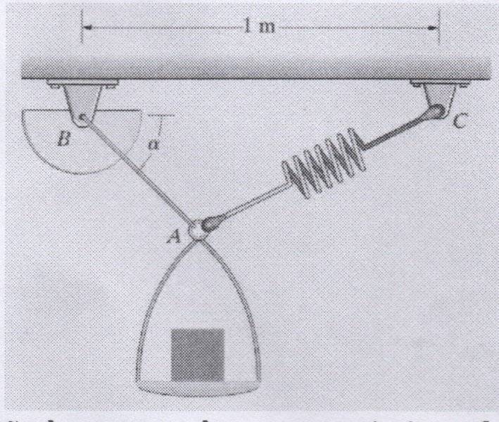 I have a project from my Mechanics class which consist on building the system on the picture. It has a spring, cable and a protractor. I have to do an approximation of the mass and weight of the object that is put in the platform by using the geometry of the system and statics concepts.