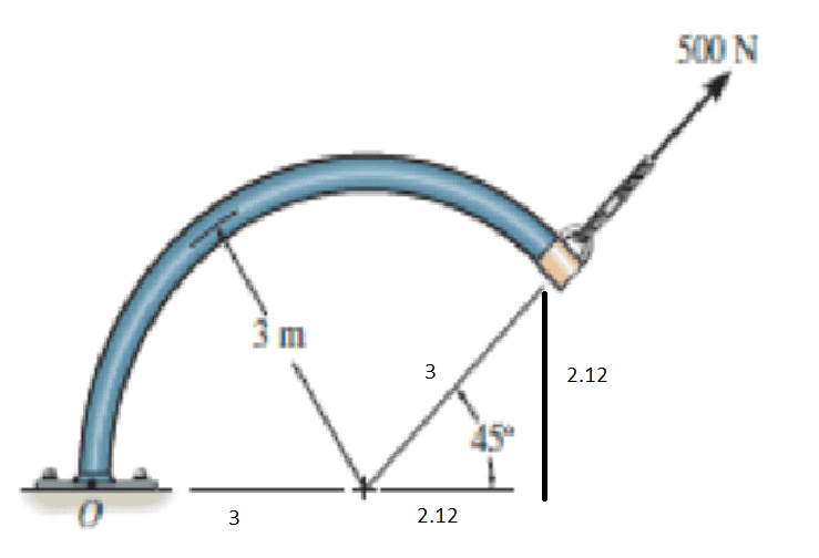 The drawing makes it clear that the line of action passes through the point (3.00, 0). That simplifies the math. Now the vertical moment arm is zero and we need only consider the vertical force component of 353.55 and the horizontal moment arm of 3.00:$$3.00 * 353.55 = 1060.65$$By inspection, this is a