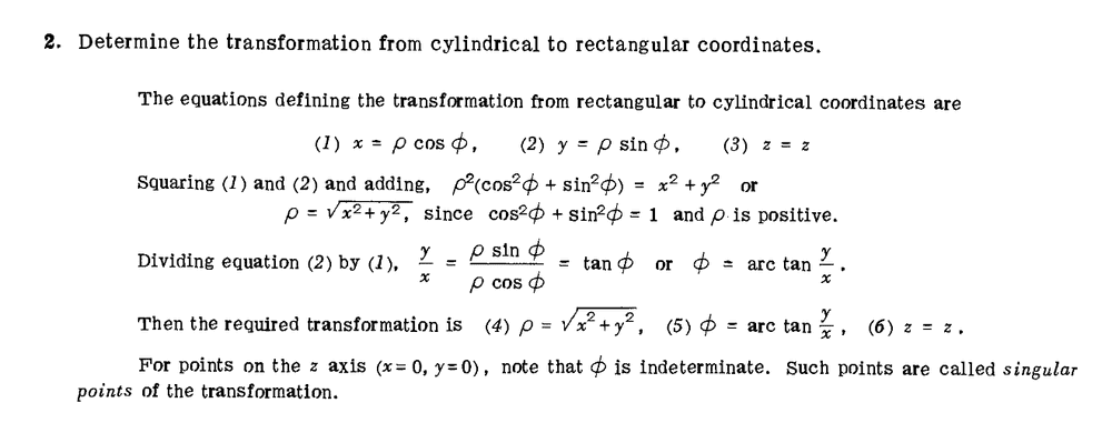 The discussion centers on the transformation from cylindrical coordinates to rectangular (Cartesian) coordinates, specifically addressing the determination of the angle \(\varphi\) in cylindrical coordinates and the challenges associated with using the arctangent function to define this angle. The scope includes mathematical reasoning and technical explanations related to coordinate transformations.