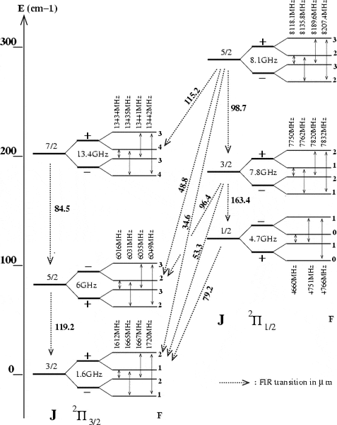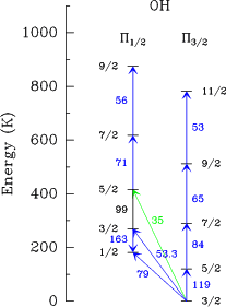From the energy level diagram for OH in the study guide, it can be seen that the first rotationally