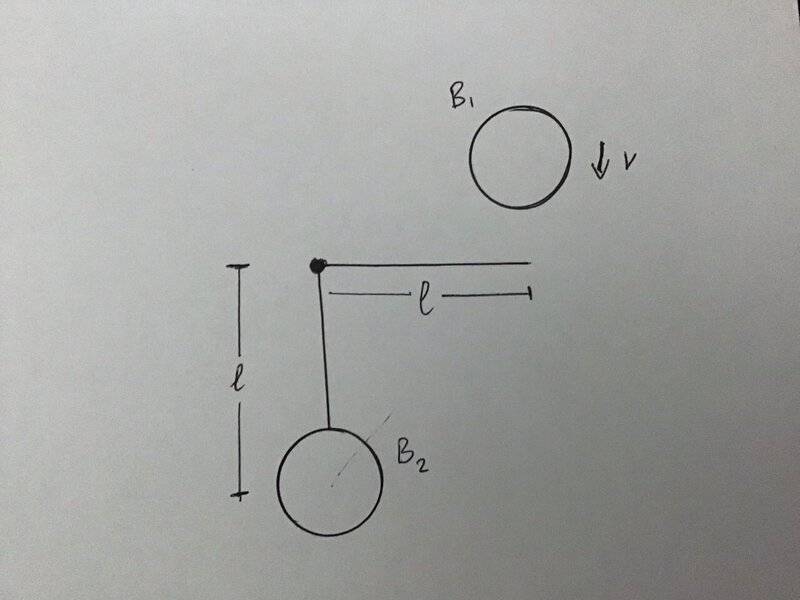 In the figure below Ball 2(B2) is hanging and attached to a square lever. B1 drop from gravity and hit the lever as shown. Calculate velocity of B1 and B2 with gravity influence right after collision. The mass of B1 and B2 is identical.