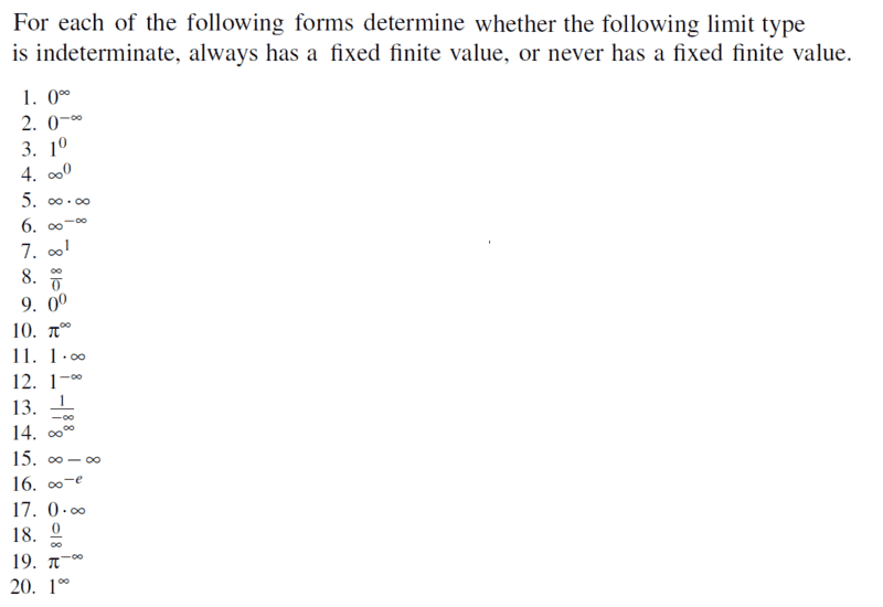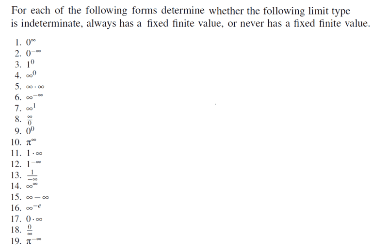 12. ##1^{-\infty}=\frac{1}{1^{\infty}}## , not sure about this one since ##1^{\infty}## is indeterminate form. My guess for this one is: ##\frac{1}{1^{\infty}}=\frac{1}{1}=1## so always has a fixed finite value