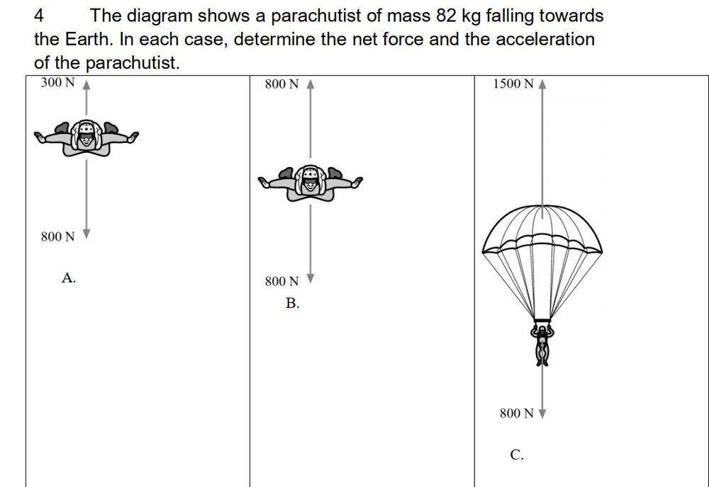 - The diagram (attached) shows a parachutist of mass 82 kg falling towards
