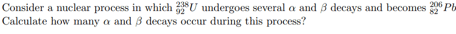 - Consider a nuclear process in which U-238 undergoes several Alpha and Beta decays and becomes Pb-206. How many Alpha and Beta decays occur in this process?