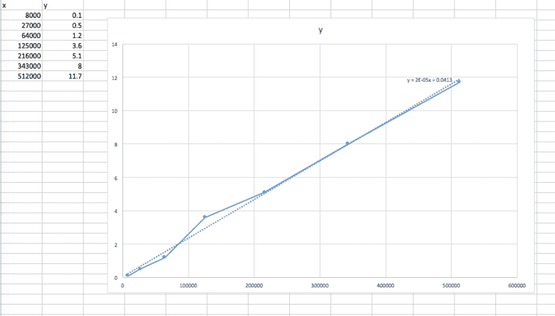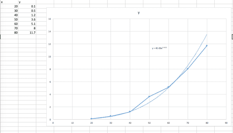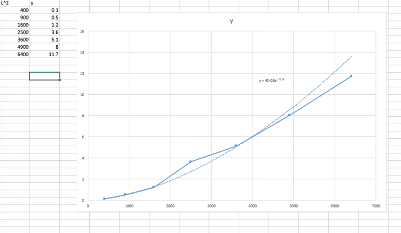 I first plotted a graph using the collected data, which resulted in an exponential relationship. Then, as per the trial and error method, I squared the L values and replotted the data, but the result was still exponential (curve). I then cubed the L values and plotted the points again, which resulted in a somewhat linear relationship. Using this, I found the relation to be: y = 2 x 10^-5(L^3). However, I am not sure this is correct, as when I plug in the L values into the equation, the result is quite off from the y values in my data set. Also, I am not sure if the graph of y vs L^3 is linear (it looks a bit off).