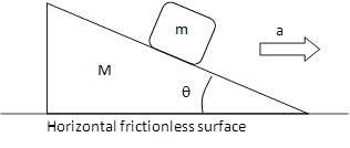 For the situation shown in the diagram, the block of mass m remains in place on the sloping front of the accelerating wedge, even though that sloping front is frictionless. Given these values, M = 20.0 kg, m = 4.00 kg, and theta= 34.0, calculate the net force acting on the wedge plus block (M+m) system.