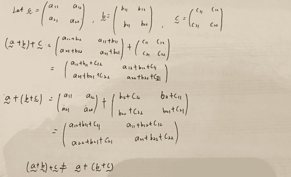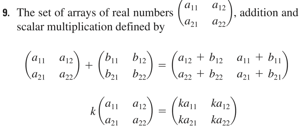 Summary:: the set of arrays of real numbers (a11, a21, a12, a22), addition and scalar multiplication defined by ; determine whether the set is a vector space; associative law