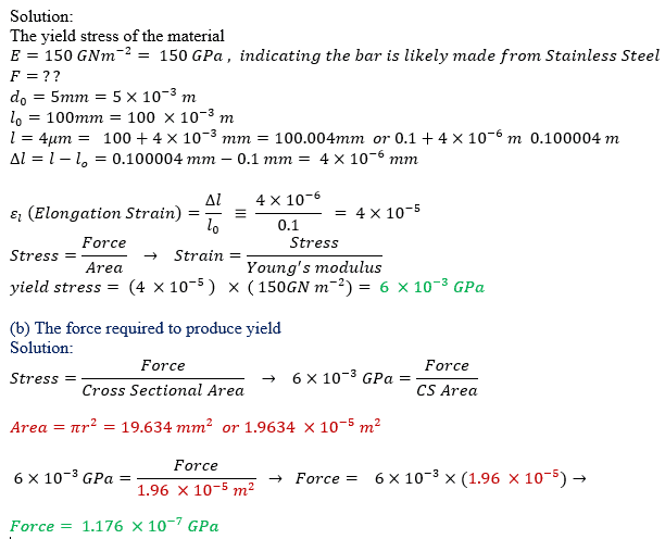 The discussion revolves around determining yield stress through calculations involving a bar subjected to tensile force. Participants engage in clarifying the appropriate area to use for calculations, unit conversions, and the correct application of stress and force units.