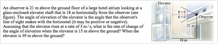 The discussion focuses on solving a related rates problem involving an observer's elevation, the height of an elevator, and the horizontal distance from the elevator shaft. The key equations derived include the differentiation of the tangent function with respect to time, leading to the formula for the rate of change of the angle of elevation, \(\frac{d\theta}{dt} = \frac{w}{(h-E)^2+w^2}\frac{dh}{dt}\). Specific calculations are provided for two heights, resulting in \(\frac{d\theta}{dt} = \frac{3}{20}\) radians per second at \(h=15\) and \(\frac{d\theta}{dt} = \frac{1}{12}\) radians per second at \(h=39\).