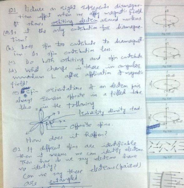 - Questions are raised regarding whether the orbiting motion of electrons is the only contribution to diamagnetism, if spin contributes, and the relative significance of these contributions.