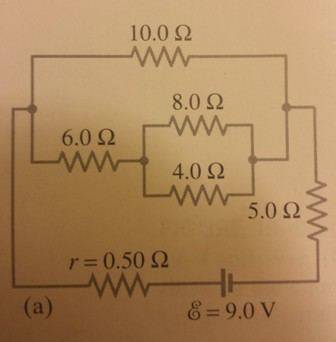 A 9.0 V battery has an internal resistance of 0.50 ? and is connected to 5 resistors, as shown in the figure below. A) What is the equivalent resistance of all the resistors (not including the internal resistance of the battery)? B) What is the total current in the circuit? C) What is the voltage across the 10.0 ? resistor?