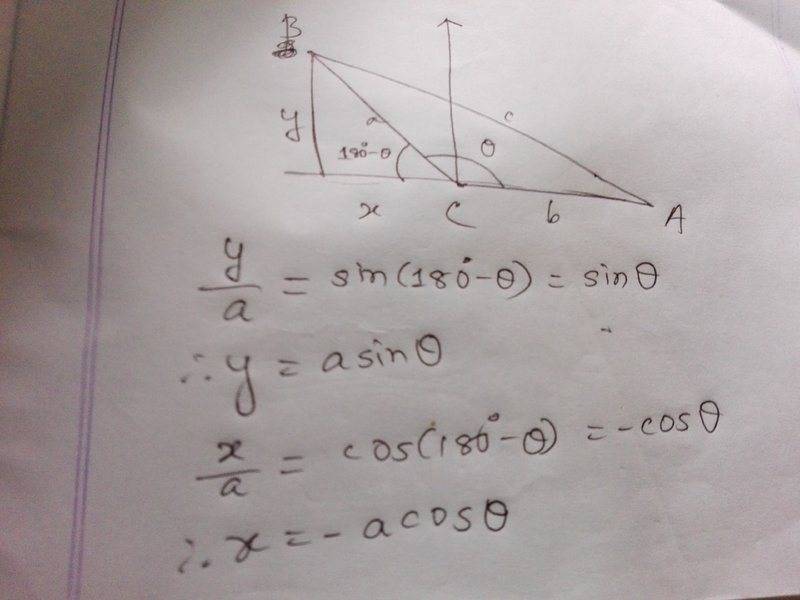 The discussion revolves around the labeling of coordinates in a diagram, specifically whether the coordinates of point B should be (a cos theta, a sin theta) or (-a cos theta, a sin theta). The scope includes conceptual clarification and technical reasoning related to coordinate systems and trigonometric functions.