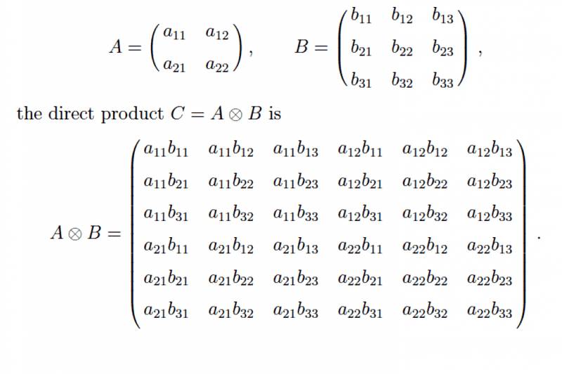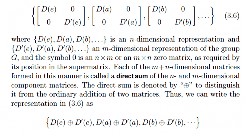 Hello! I am reading something about applications of group theory in quantum mechanics and I got confused about the difference between direct sum and direct product. In many places I found that they mean the same thing. However, the ways I found them defined in the book I read from, seem to be different, even if they use the same mathematical symbol to represent the 2 of them. I attached the 2 ways they are defined in the book. So according to these definitions, if I understand it right, If A is 2x2 and B is 3x3, the direct sum will be 5x5 and the direct product will be 6x6, which are obviously not the same thing. So, can anyone explain this to me please? Thank you!