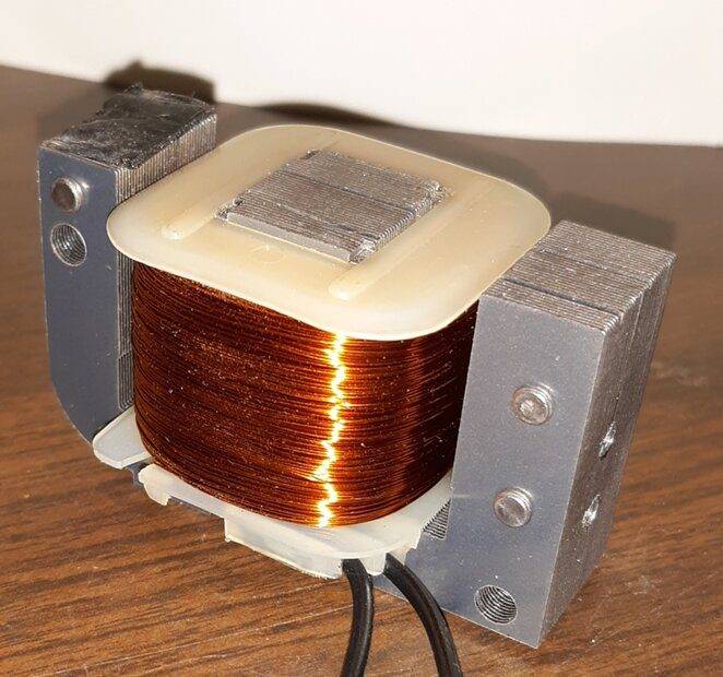 Lately I've been experimenting with the ways an electromagnet effects a Rare Earth magnet. The electromagnet we used was taken from a vibrator massager, probably 50s vintage. The resistance of the coil is 96 ohms and consumes about 1.25 amps when operated on 120 volts AC. When the electromagnet is energized, a small Rare Earth magnet will vibrate (probably in harmony with the 60 hertz AC). If the magnet is held in the palm this vibration can be felt as far as 12 inches from the coil. However the coil runs hot and is burning a hot of amps.