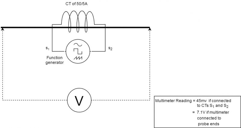 You are using a current transformer backwards to inject current into a common mode bundle of wires. The CT turns ratio is then 10 : 1.