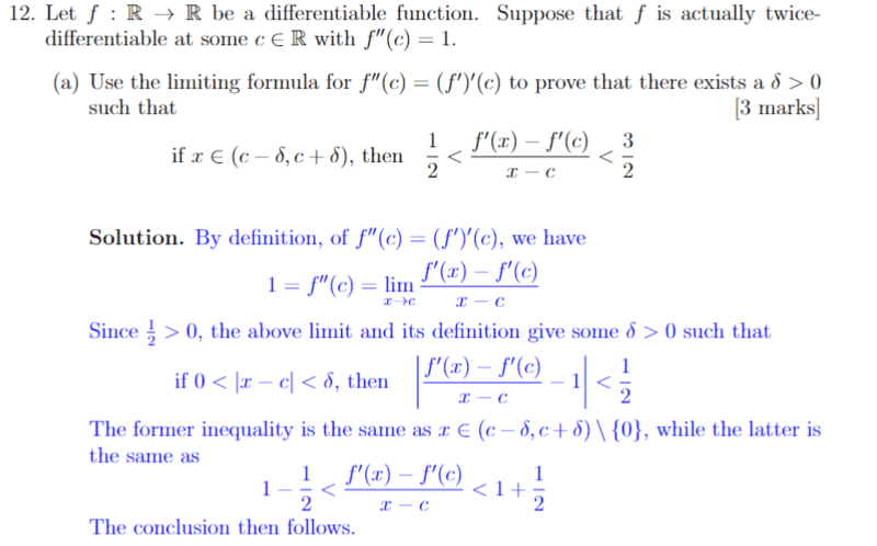 I'm confused by the implication from the antecedent ##0 < |x - c| < \delta## to the consequent. Should the consequent not be ##|f''(x) - f''(c)| < \frac{1}{2}## where ##\epsilon = \frac{1}{2}## (Since we are applying the definition of a limit for the first derivative curve)?