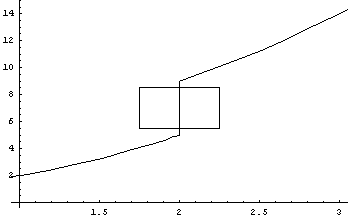 As you can see, the tangent line and the original function are starting to "merge" - it's almost as if they are starting to look like the same curve. If, on the other hand, we zoom in on the corner example, as follows: