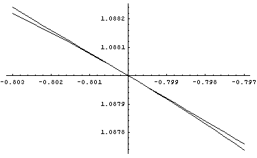 Evidently, we need to change our concept of what a tangent line is. One of the more important ideas relating to tangent lines is that this is a local phenomenon. This avoids the first issue I raised above, since the second intersection is not "right next to" where we would like to call it a tangent line. As for the second issue, let's take the first graph and zoom in a few times to see what's really happening: