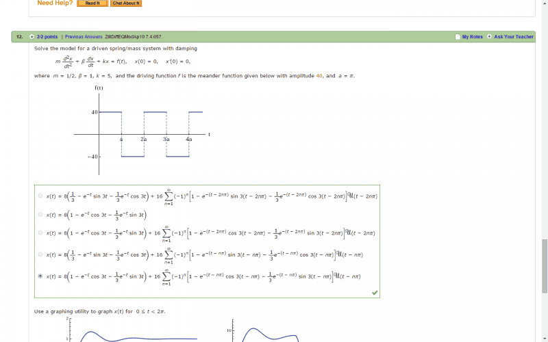 The discussion revolves around solving a differential equation involving Laplace transforms and periodic functions, specifically in the context of a spring system with given parameters such as amplitude and a constant.