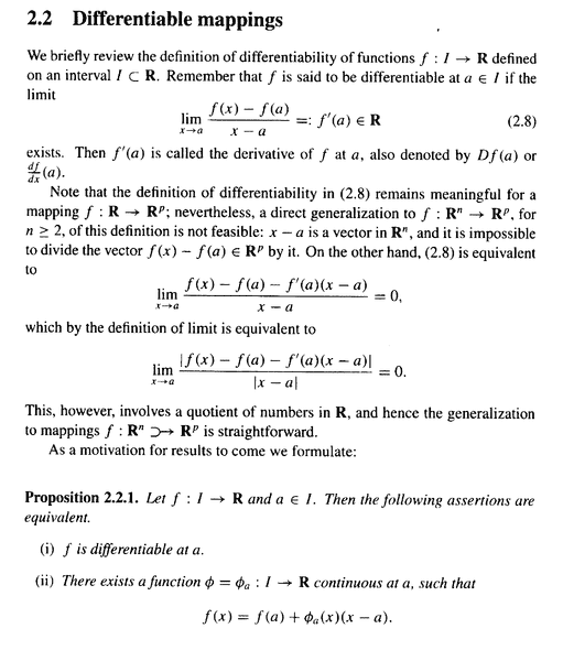 " ... ... Or, in other words since ##(x - a)^t y = \langle x - a , y \rangle \in \mathbb{R}## for ##y \in \mathbb{R}^n##,##\phi_a(x) y = Df(a)y + \frac{ \langle x - a , y \rangle }{ \| x - a \|^2 } \epsilon_a ( x _ a ) \in \mathbb{R}^p \ \ \ (x \in U \setminus \{ a \} , y \in \mathbb{R}^n )##.