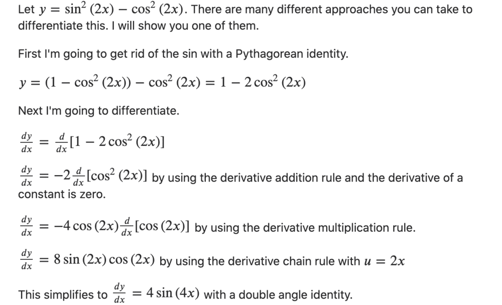 The discussion revolves around the differentiation and simplification of the function f(x) = sin²(2x) - cos²(2x), focusing on whether the expression has been fully simplified.