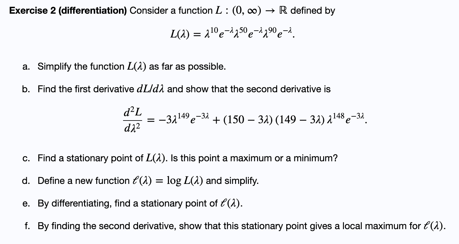 The discussion focuses on finding the second derivative of the function $L(\lambda) = \lambda^{150}e^{-3\lambda}$. The first derivative is calculated as $L’(\lambda) = 3\lambda^{149}e^{-3\lambda} (50-\lambda)$. Participants emphasize the application of the product rule for differentiation, specifically using the formula $L’’ = u’vw + uv’w + uvw’$ to derive the second derivative. This method ensures accurate differentiation of products of functions.
