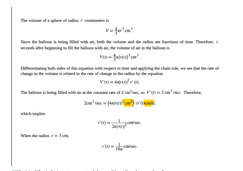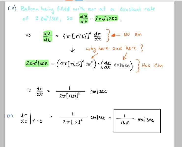 First, we had an original volume function written as ##V(t) = \frac{4}{3}π[r(t)]^3cm^3## and we differentiated both sides, giving ## \frac{dV}{dt} = 4π[r(t)]^2\frac{dr}{dt} ## Notice that the cm units are missing. Why were they taken out?
