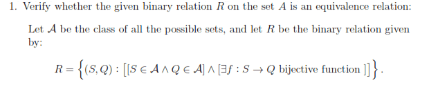 I'm not sure how to demonstrate symmetry here. By definition I'd have to show ##\forall S \forall Q ((S,Q) \in R \rightarrow (Q,S) \in R)##, which really just boils down to showing that ##[\exists f : (S \rightarrow Q \space\ bijective function) \rightarrow (Q \rightarrow S \space\ bijective function) ]##, if I'm not mistaken?However, in this case, S and Q are two different functions, so I can't just use the identity function like with reflexivity... and that's where I'm stuck. I'm not sure how to show symmetry or transitivity here.