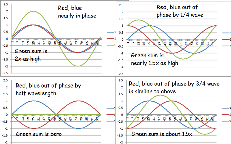 (*) Interference is constructive from 0 to 0.25, destructive from 0.25 to 0.75, with complete cancellation at 0.5, and constructive from 0.75 to 1 (and on to 1.25, which of course is 0 to 0.25 of the next wave.) Some examples are shown here
