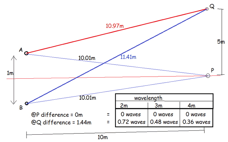 But if the wavelength were instead 2m, then 1.44m is about 1.44/2 = 0.72 of a complete wave. So the waves are out of phase by nearly 3/4 of a wave (the bottom right diagram) and partially support each other. Now the point Q will be bright, though not as bright as the centre point P where the waves fully reinforce each other.