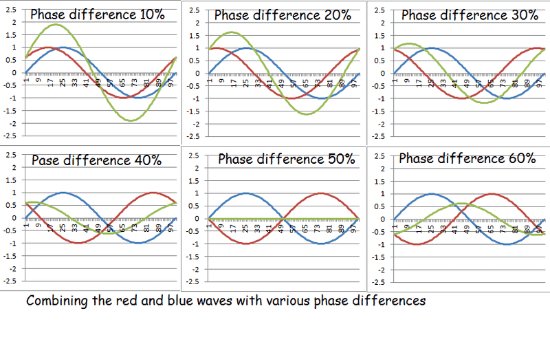 In these picture we add two equal waves (shown red & blue) and show the result in green