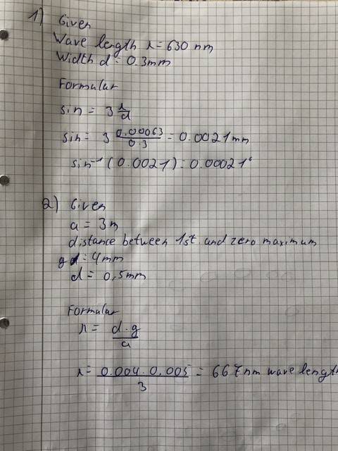 1.Calculate the Angel below the 3rd.diffraction minimum behind a single slith that's 0.3 mm width. The laserpointer is a red one with a wave length of 630nm.