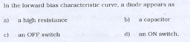 The discussion focuses on the forward bias characteristics of diodes, specifically silicon diodes with a breakdown voltage of 0.7 V. The consensus is that when the applied voltage is below this threshold, the current remains low, while exceeding this voltage leads to saturation. The participant confirms their understanding of the concept by identifying the ON switch as the correct answer based on the provided options.