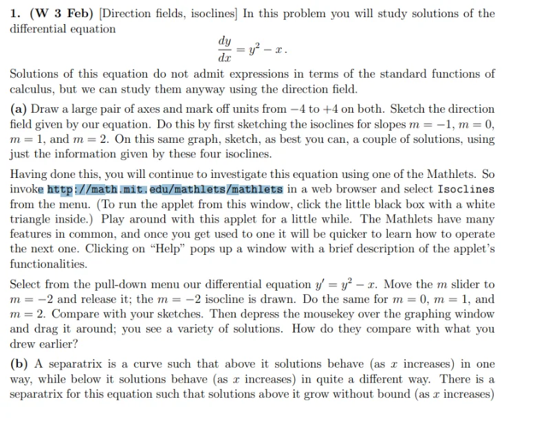 I sketched the isoclines for $$ m=-1,0,1,2 $$. Since both $$ \frac{dy}{dx} $$ and $$ D_{y} \frac{dy}{dx} $$ are continuous on the square region R defined by $$ -4\leq x \leq 4, -4 \leq y \leq 4 $$ the existence and uniqueness theorem guarantees that if we pick a point in the interior that lies on an isocline there will be a unique differentiable function (solution) passing through that point. I understand that a solution exists but I unsure how to actually sketch it. For example, consider a point (-2,0) which lies on the isocline $$ y^2-x=2 $$. At this point the slope is 2 so the differentiable function passing through it is increasing as x increases. How do I determine the approximate behavior of the solution curve for other points? How can I tell the solution will cross other isoclines and thus understand how the slope changes?