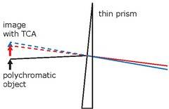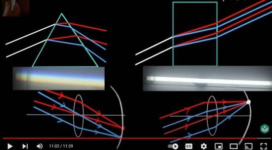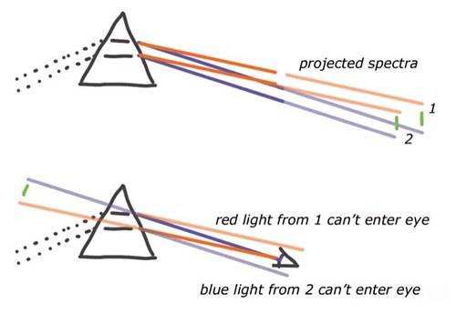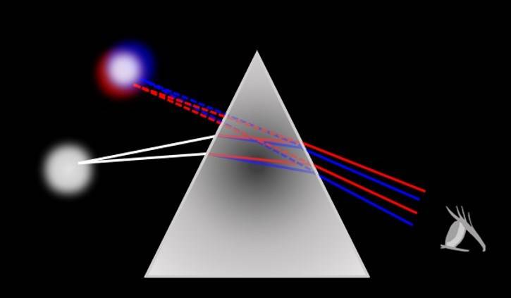 - Take a photo through a glass prism to view a light source. Notice that in the photo taken, the object seen through the prism has two colored edges, one red and one blue (i.e., “dispersion”). Draw a light ray diagram and find out which color has the higher refractive index through the prism. Note that our eyes were seeing a virtual image of the object through the prism.