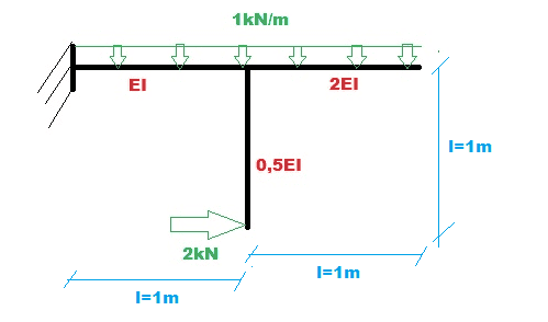 The discussion revolves around calculating the displacement of a specific node in a structural system using the method of superposition of forces. Participants explore various approaches to analyze the forces acting on different elements of the structure, particularly focusing on the implications of different flexural rigidities (EI) and the resulting displacements.