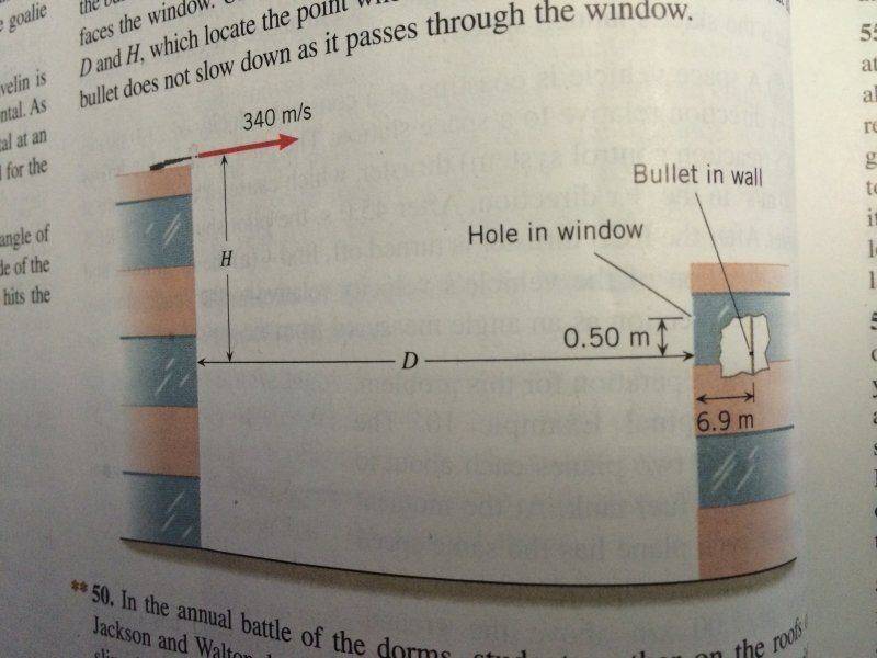 From the top of a tall building, a gun is fired. The bullet leaves the gun at a speed of 340 m/s, parallel to the ground. As the drawing shows, the bullet puts a hole in a window of another building and hits the wall that faces the window. Using the data in the drawing, determine the distances D and H, which locate the point where the gun was fired. Assume that the bullet does not slow down as it passes through the window.