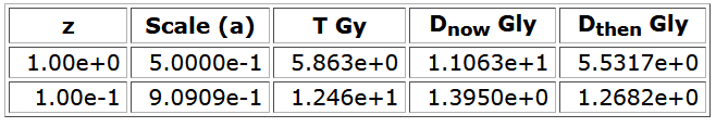 For the same observed object, for an observer at t=12.46 Gyr, a=0.909, and z=0.1, one may want to know what are the corresponding values of D(then) and D(now). Here are the proper distances in that case obtained from Nick Gnedin’s calculator:
