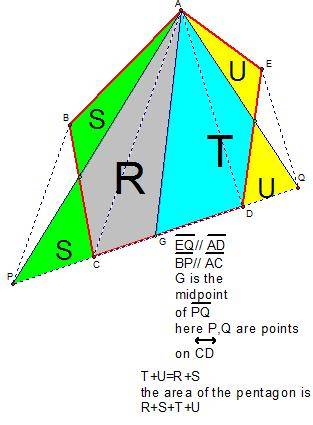 - Another participant suggests that for a regular pentagon, constructing the midpoint of segment CD and drawing a line from A to that midpoint will divide the area equally.