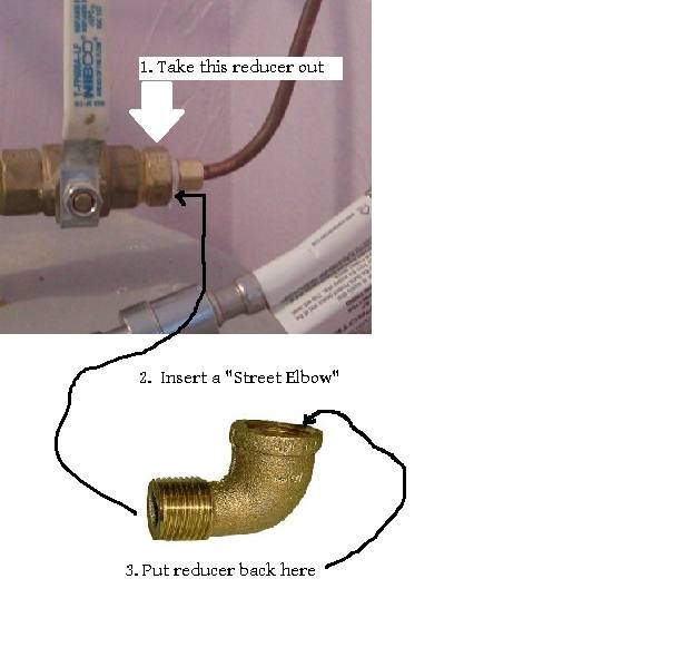 The situation shown in the photo: I need to replace a 1/4 inch copper tube water supply line (to the ice maker on a refrigerator) with a 1/4 inch braided line. But the braided line has a burst protector on the end so it can't make the sharp 90 degree turn needed go from the valve up the wall.