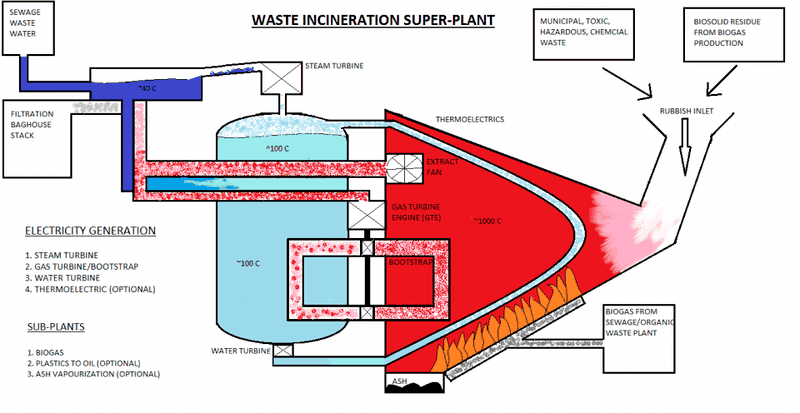 The discussion revolves around the feasibility and design of a proposed waste-to-energy plant. Participants explore various engineering principles, efficiency concerns, and the integration of different technologies such as turbines and boilers. The conversation includes technical specifications and potential challenges related to the system's operation.