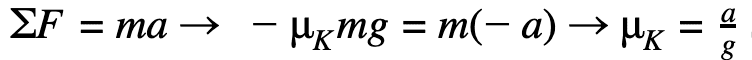 In this part of the lab we pushed a block on a flat table and let it slide until it stopped. So it is decelerating with no force being applied to it while moving. In this case acceleration is negative. The only force acting on it is kinetic friction. Therefore I have come up with the following equation to solve for the coefficient of kinetic friction