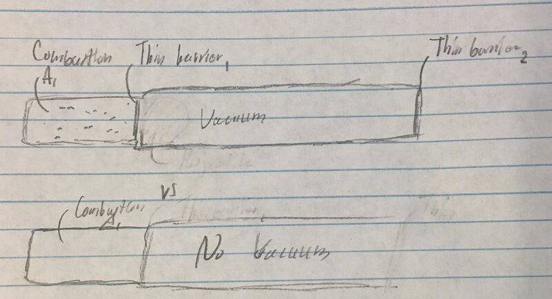 So if a gas is combusted, would it travel faster through a vacuum tube or a regular ole' tube? I would assume the vacuum tube, as there are less particulates collisions in the way of the fast-moving gas molecules. Yet this also implies pressure on the outside of the thin barrier _ 2, indicating a large pressure resistance would be met when puncturing the last stretch of the tube. I am unsure because I haven't taken any gas dynamics / thermo classes yet. It would help a good bit if anyone can answer!