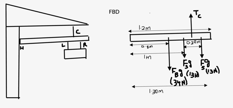 $$F_B\cdot d_1 + F_S\cdot d_2 = F_C \cdot d_3$$