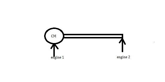 Stick is is deep space,engine 1 is act at CM, engine 2 is turn OFF,stick travel with constant speed v.