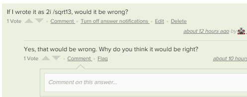 - Some participants suggest that it does not matter where i is placed as long as it is clear whether i is inside the square root or not.